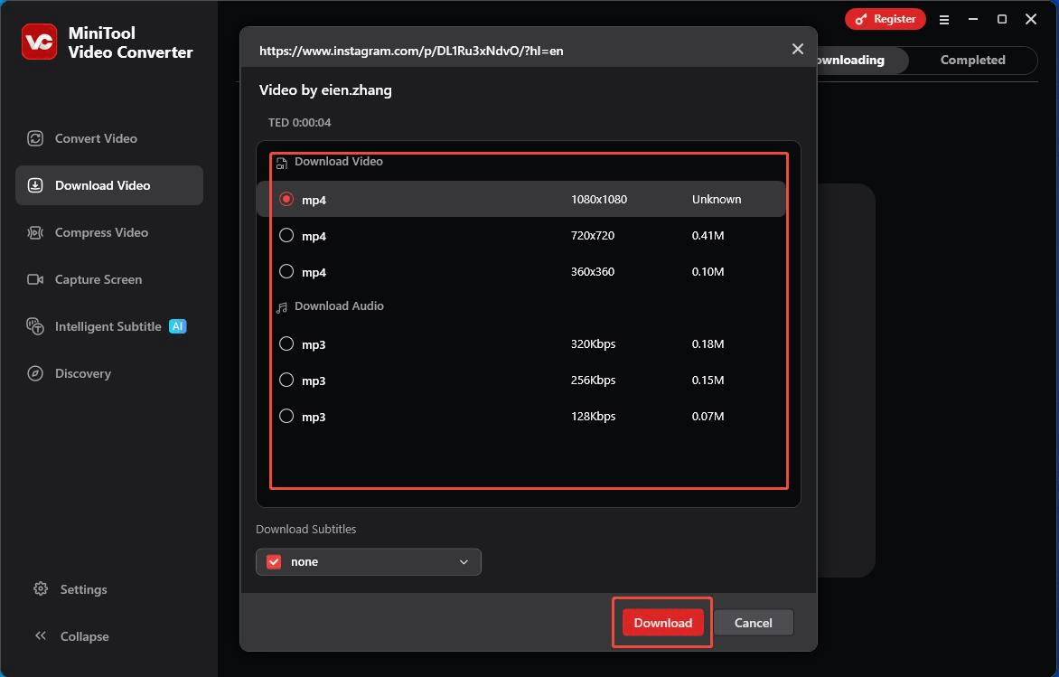 1. Wählen Sie im neuen Pop-up-Fenster unter Video herunterladen das Ausgabeformat und die Auflösung des Instagram-Videos aus.