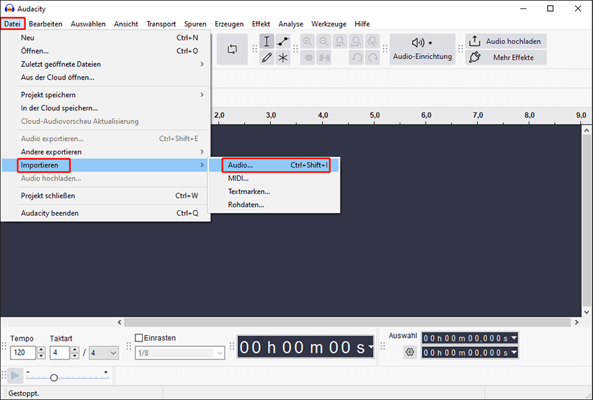 Schritt 1: Öffnen Sie Audacity, wählen Sie den Tab Datei in der oberen linken Ecke der Benutzeroberfläche, wählen Sie die Option Importieren und klicken Sie auf Audio.